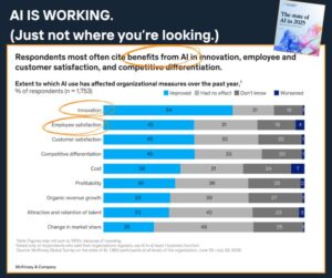Innovation is improving 64 percent and employee satisfaction 45 percent, yet profit impact sits at 36 percent and revenue at 33 percent. That gap is normal at this stage of AI adoption.